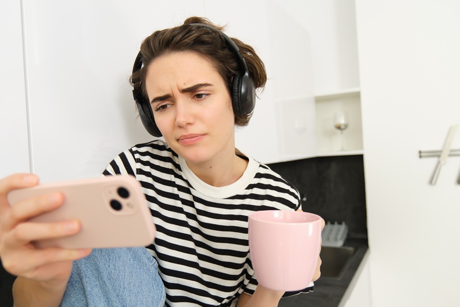 Image of woman with disappointed, reluctant face expression, watching boring show or movie on smartphone, wearing headphones, drinking tea and chilling in the kitchen.