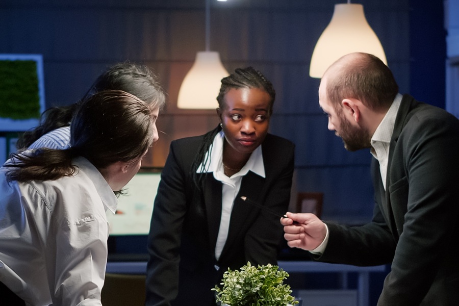 Diverse businesspeople discussing over management paperwork standing at conference table