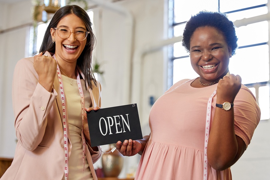 Fashion, portrait and women with open sign for small business success, celebration and achievement. Smile, tailor and excited people at launch of shop for designer clothes, retail or creative startup