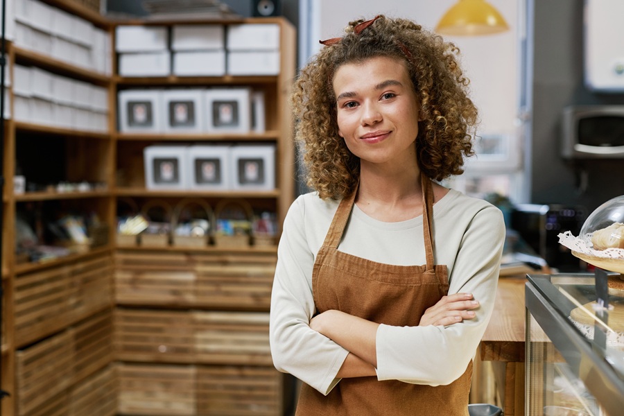 Portrait of young smiling bakery owner crossing arms and looking at camera